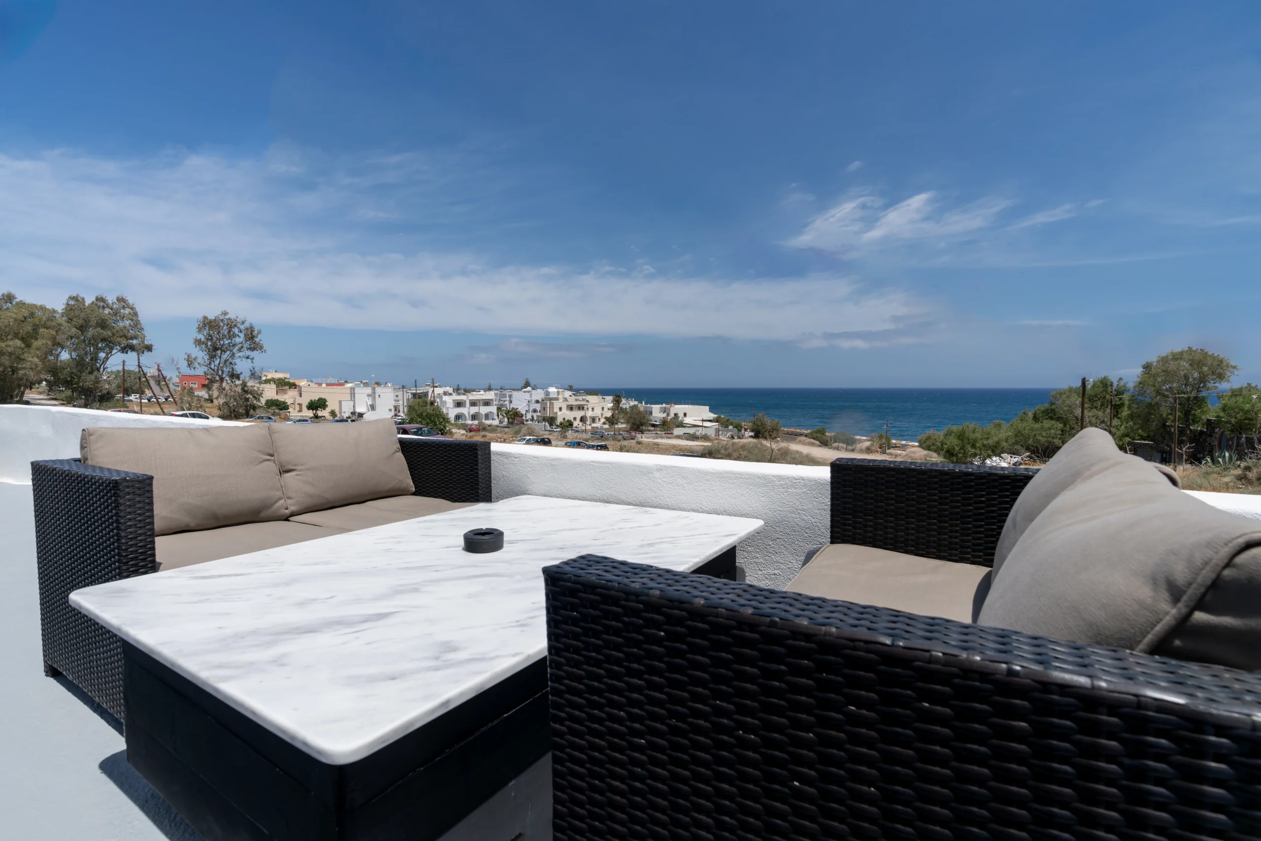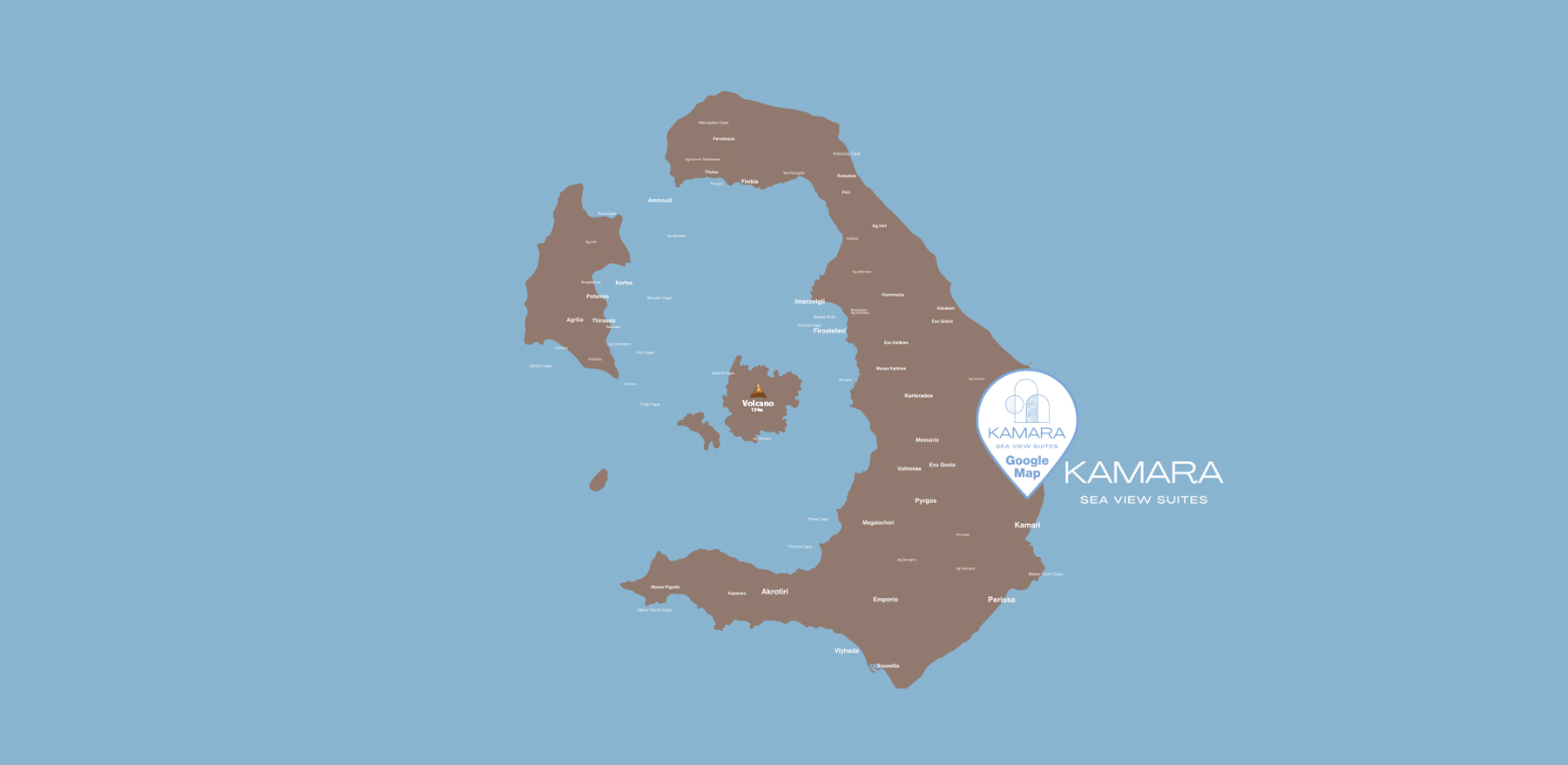 Kamara Sea View Suites are located at the southern end of Kamari Beach, in a quiet and privileged area at the foot of Mesa Vouno Mountain, just a 2-minute walk from the famous black sand beach and only 150 meters from Kamari’s main street, the local bus stop, shops, and restaurants.